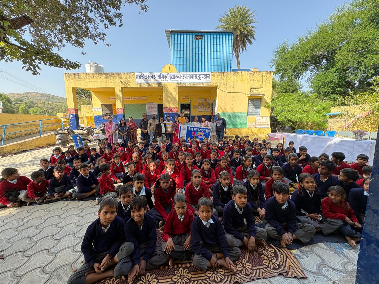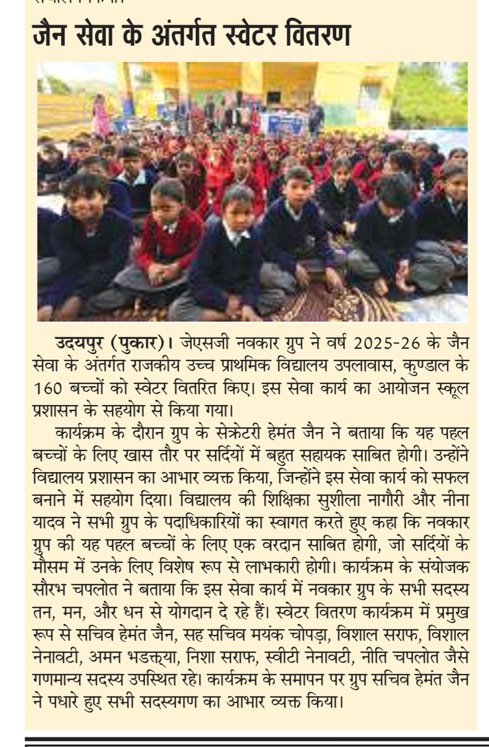 *जेएसजी नवकार ग्रुप द्वारा जैन सेवा के अंतर्गत राजकीय उच्च प्राथमिक विद्यालय उपलावास, कुण्डाल के 160 बच्चों को स्वेटर वितरण* जे एस जी नवकार ग्रुप के सेक्रेटरी हेमंत जैन ने बताया कि नवकार ग्रुप द्वारा वर्ष 2025-26 के जैन सेवा के अंतर्गत दौरान राजकीय उच्च प्राथमिक विद्यालय उपलावास, कुण्डाल के कक्षा एक से आठवीं तक के 160 बच्चों को स्वेटर वितरण किये गये। नवकार ग्रुप द्वारा आयोजित दूसरे स्वेटर वितरण सेवा कार्य का अवसर देने के लिए विद्यालय प्रशासन का आभार व्यक्त किया गया। इस अवसर पर विद्यालय की शिक्षका श्रीमती सुशीला नागौरी एवं नीना यादव ने सभी पदाधिकारियों का स्वागत करते हुए कहा कि नवकार ग्रुप की यह पहल बच्चों के लिए आने वाले मौसम वरदान साबित होंगी। कार्यक्रम संयोजक सौरभ चपलोत ने बताया कि सेवा कार्य मे सभी सदस्यों ने तन मन धन से भाग लेकर अपना आर्थिक सहयोग दिया। सेवा कार्य में सचिव हेमंत जैन, सहसचिव मयंक चोपड़ा, विशाल सराफ , विशाल नेनावटी, अमन भडक्त्या, निशा सराफ , स्वीटी नेनावटी , निति चपलोत आदि गणमान्य सदस्यों की उपस्थिति रही। कार्यक्रम में पधारे सभी सदस्यों का आभार ग्रुप सचिव हेमंत जैन ने किया।