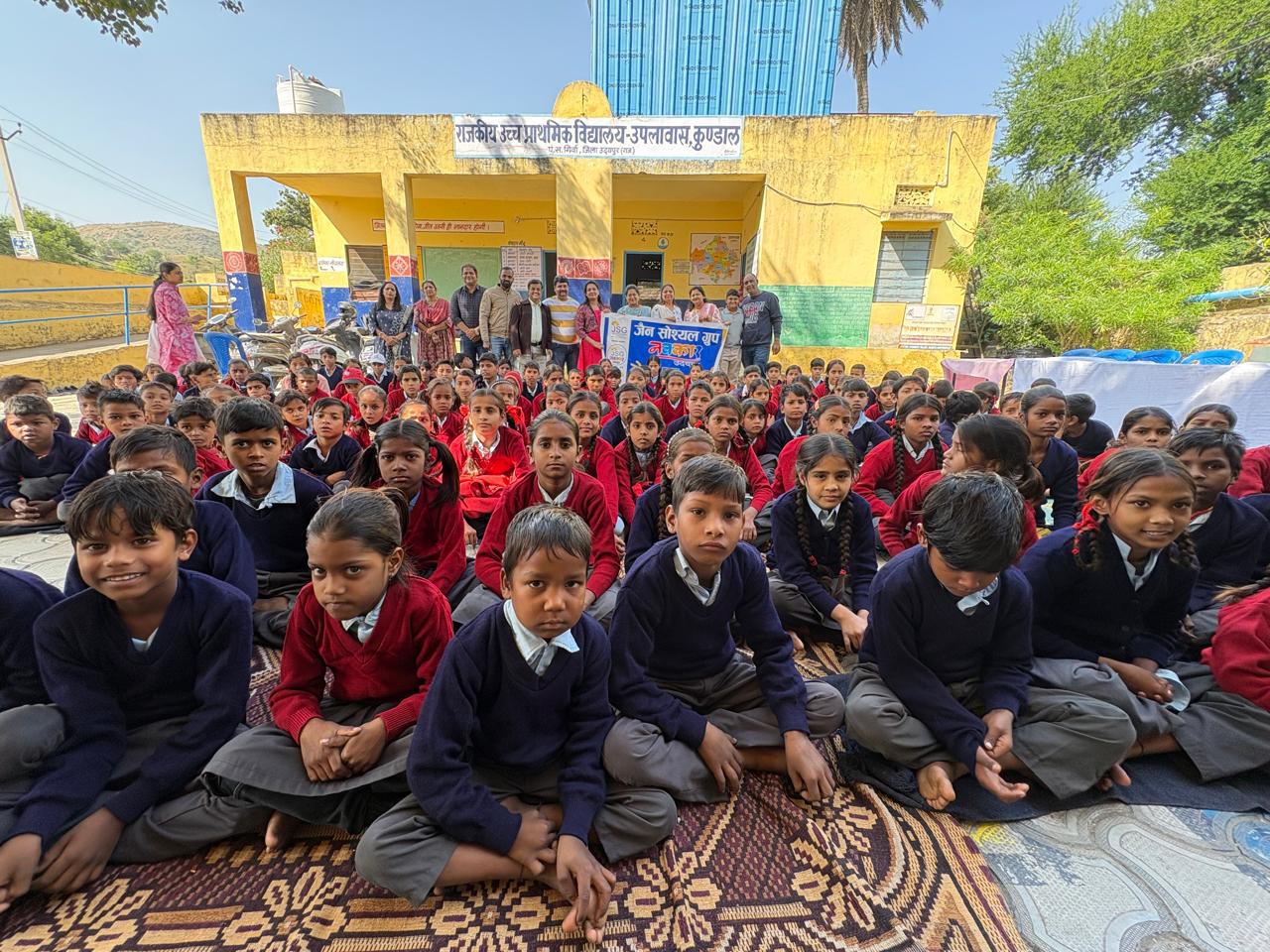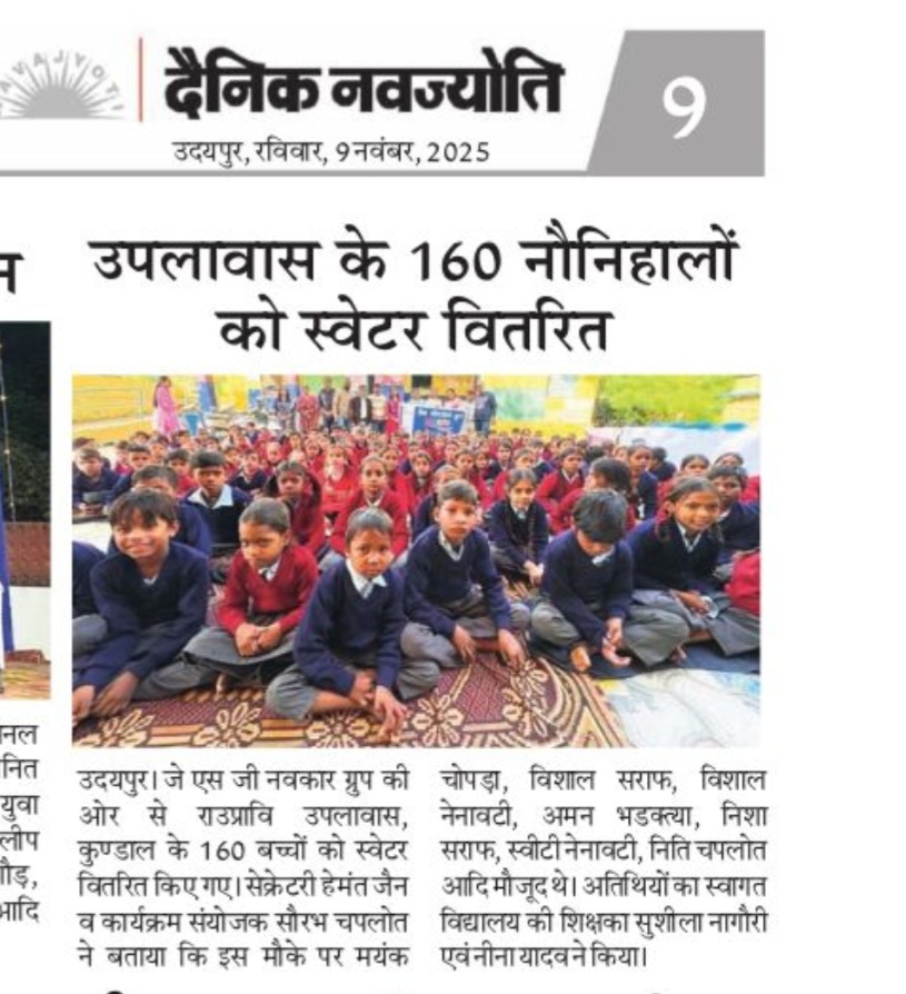 *जेएसजी नवकार ग्रुप द्वारा जैन सेवा के अंतर्गत राजकीय उच्च प्राथमिक विद्यालय उपलावास, कुण्डाल के 160 बच्चों को स्वेटर वितरण* जे एस जी नवकार ग्रुप के सेक्रेटरी हेमंत जैन ने बताया कि नवकार ग्रुप द्वारा वर्ष 2025-26 के जैन सेवा के अंतर्गत दौरान राजकीय उच्च प्राथमिक विद्यालय उपलावास, कुण्डाल के कक्षा एक से आठवीं तक के 160 बच्चों को स्वेटर वितरण किये गये। नवकार ग्रुप द्वारा आयोजित दूसरे स्वेटर वितरण सेवा कार्य का अवसर देने के लिए विद्यालय प्रशासन का आभार व्यक्त किया गया। इस अवसर पर विद्यालय की शिक्षका श्रीमती सुशीला नागौरी एवं नीना यादव ने सभी पदाधिकारियों का स्वागत करते हुए कहा कि नवकार ग्रुप की यह पहल बच्चों के लिए आने वाले मौसम वरदान साबित होंगी। कार्यक्रम संयोजक सौरभ चपलोत ने बताया कि सेवा कार्य मे सभी सदस्यों ने तन मन धन से भाग लेकर अपना आर्थिक सहयोग दिया। सेवा कार्य में सचिव हेमंत जैन, सहसचिव मयंक चोपड़ा, विशाल सराफ , विशाल नेनावटी, अमन भडक्त्या, निशा सराफ , स्वीटी नेनावटी , निति चपलोत आदि गणमान्य सदस्यों की उपस्थिति रही। कार्यक्रम में पधारे सभी सदस्यों का आभार ग्रुप सचिव हेमंत जैन ने किया।